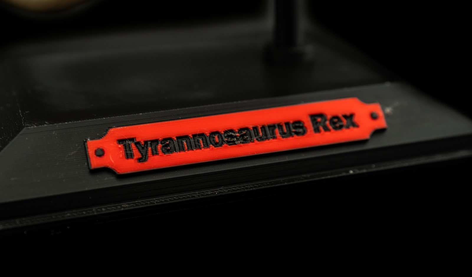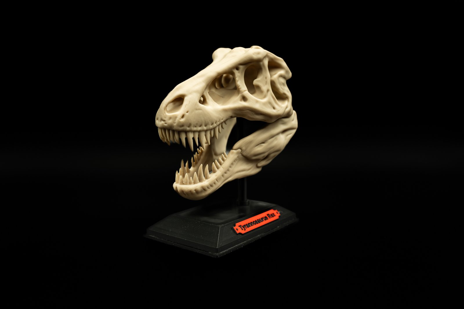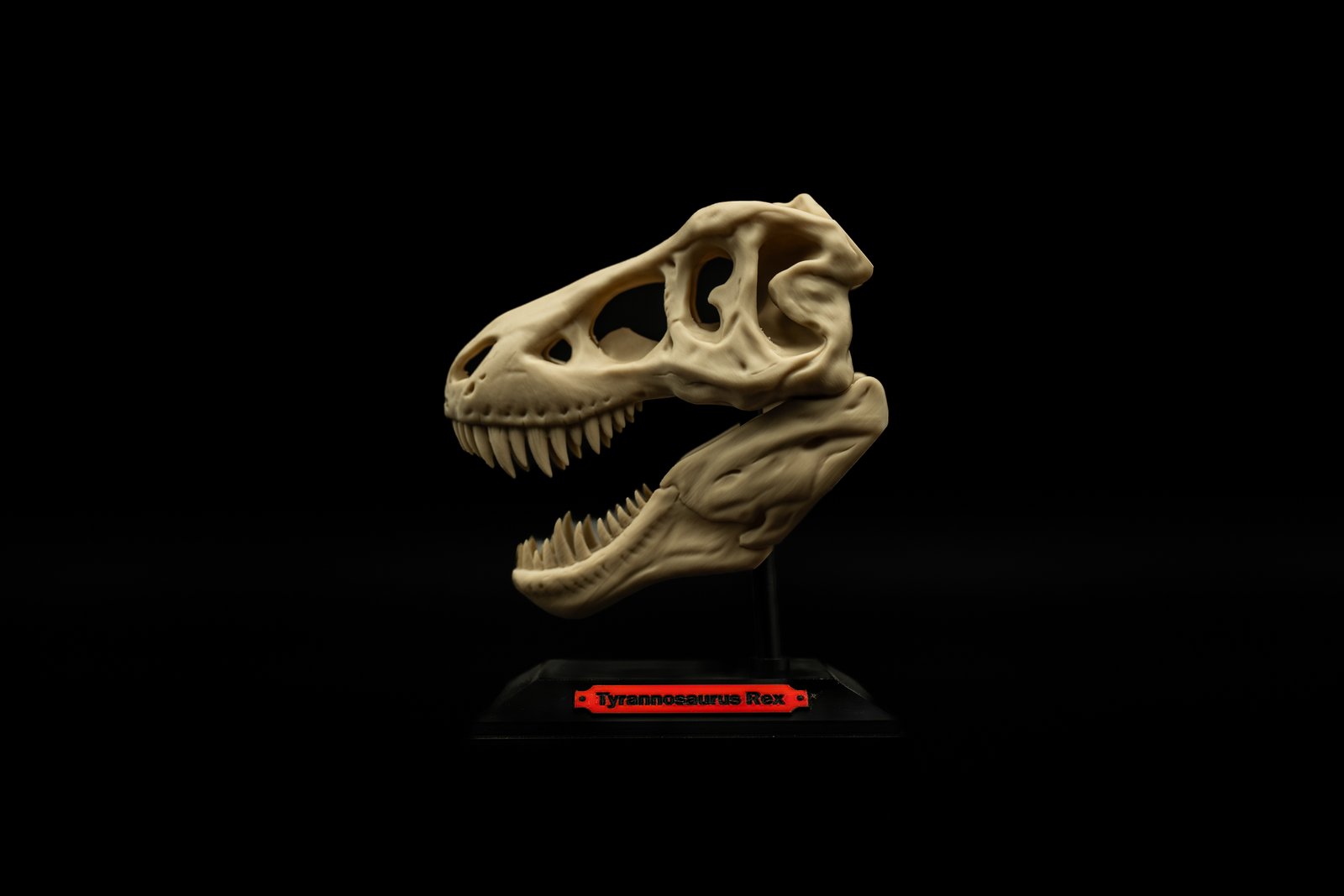 Model czaszki Tyranozaura Rex o długości 15 cm wykonany w technologii druku 3D z PLA w kolorze kości. Realistyczna replika na stojaku ekspozycyjnym – idealna dekoracja do biura, gabinetu lub prezent dla miłośnika dinozaurów.