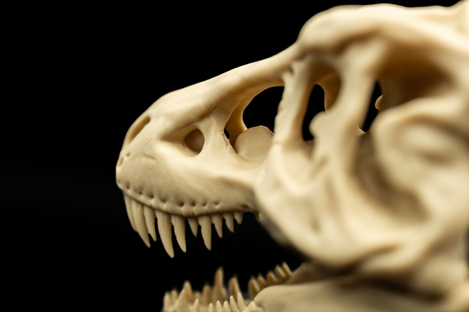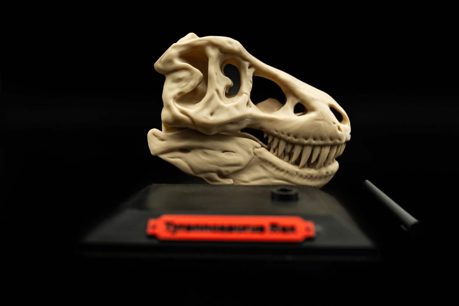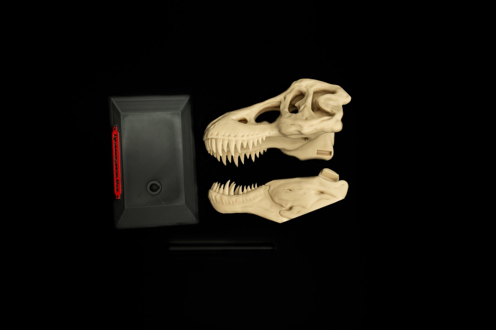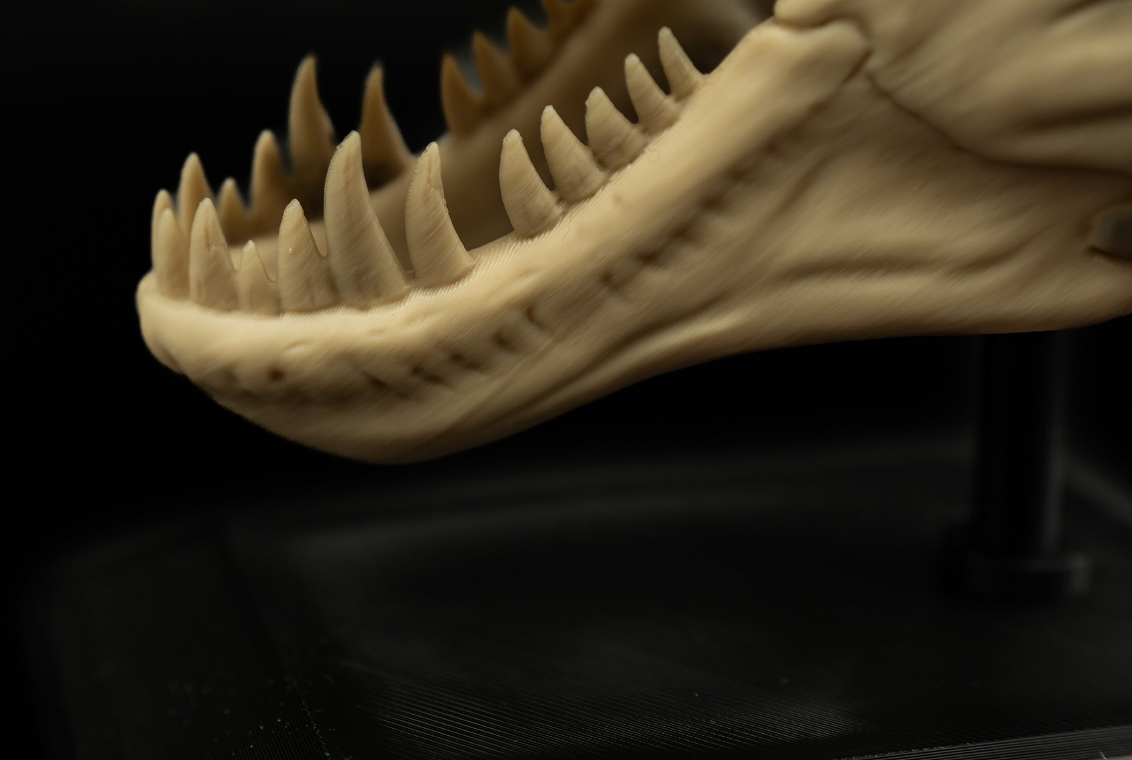 Model czaszki Tyranozaura wykonany w technologii druku 3D z filamentu PLA w kolorze kości (Bone). Realistycznie odwzorowane detale – uzębienie, struktura czaszki oraz proporcje – nadają modelowi kolekcjonerski i edukacyjny charakter.