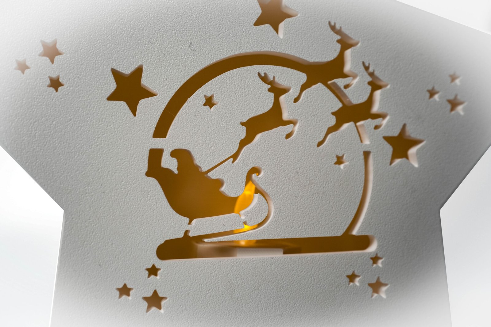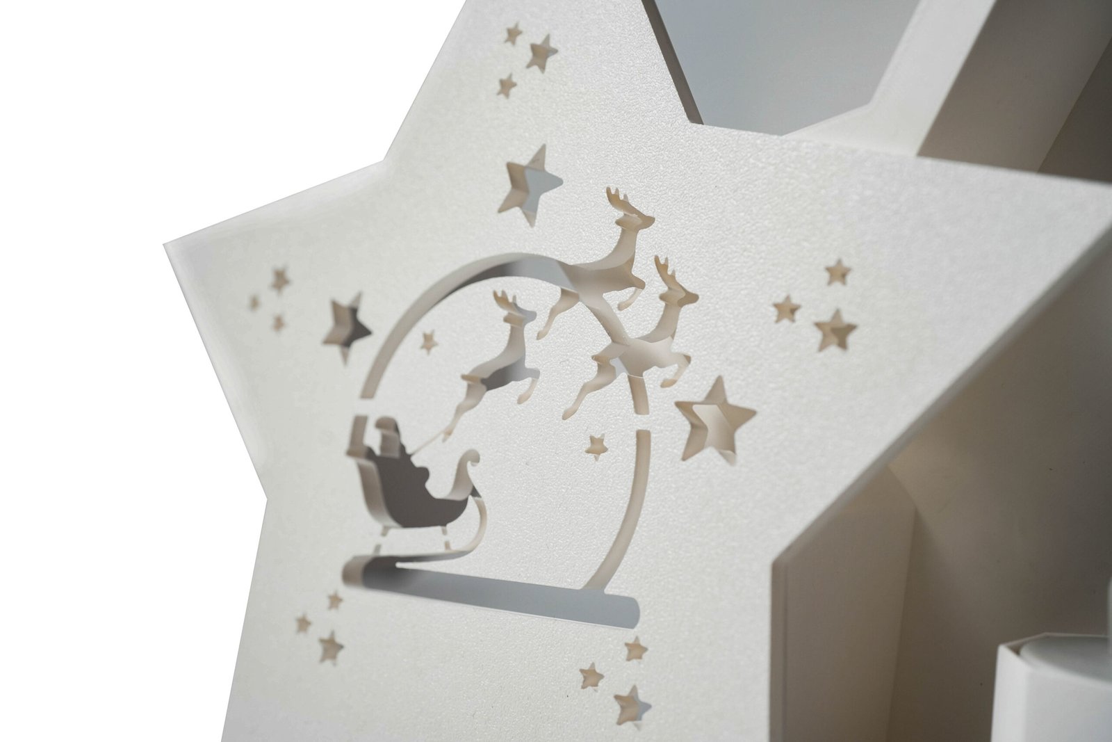 Druk 3D z materiału PLA. W podstawie znajduje się miejsce na świeczkę LED Tealight (w zestawie), której światło przenika przez ozdobny wzór z Mikołajem i reniferami.