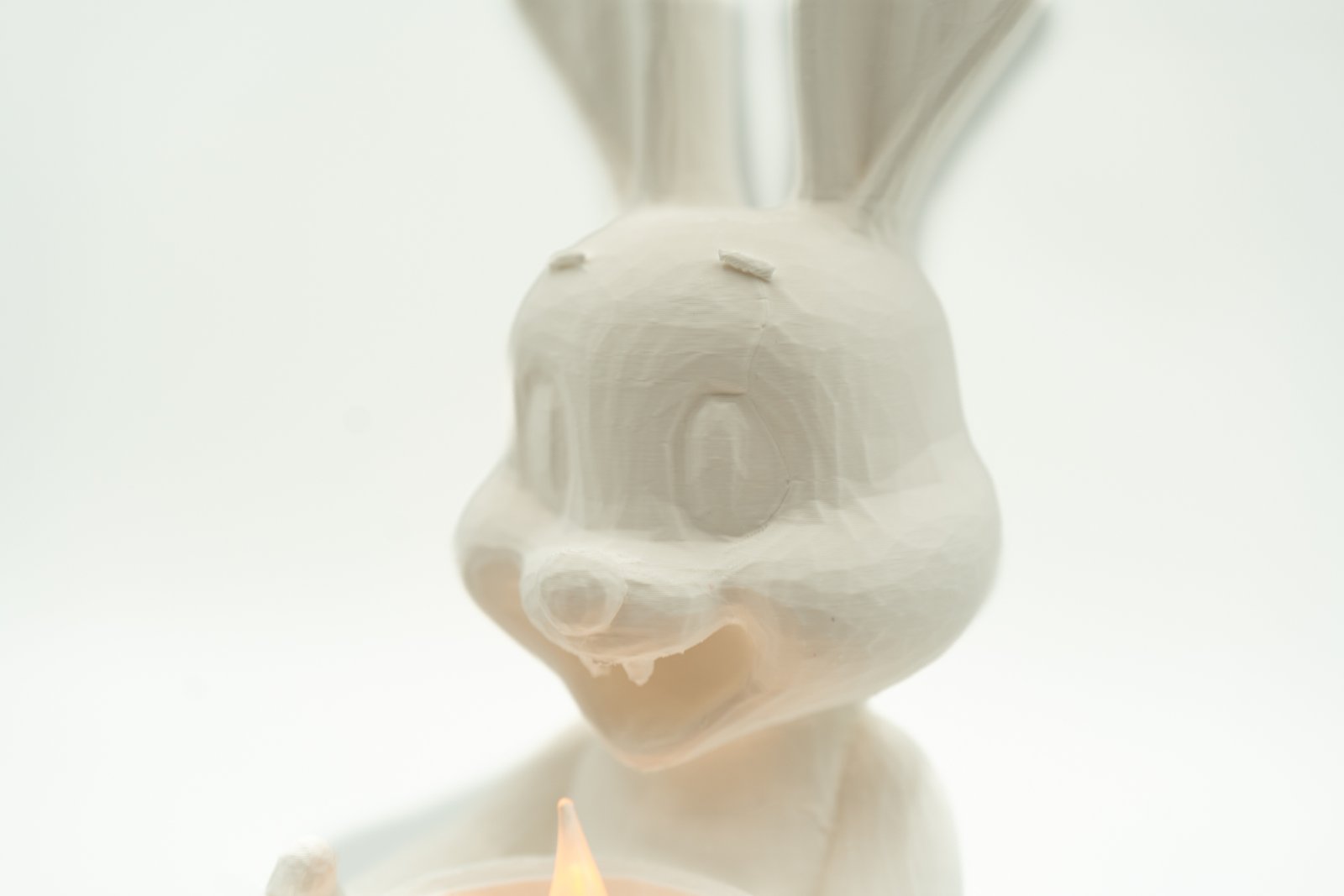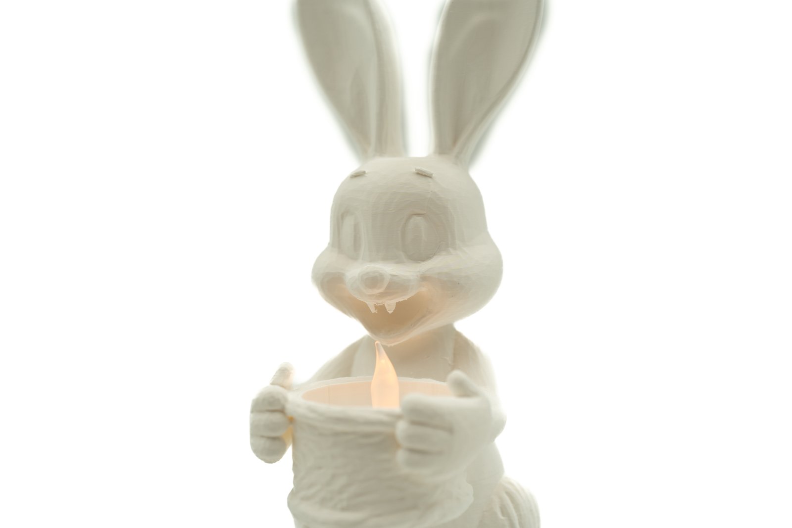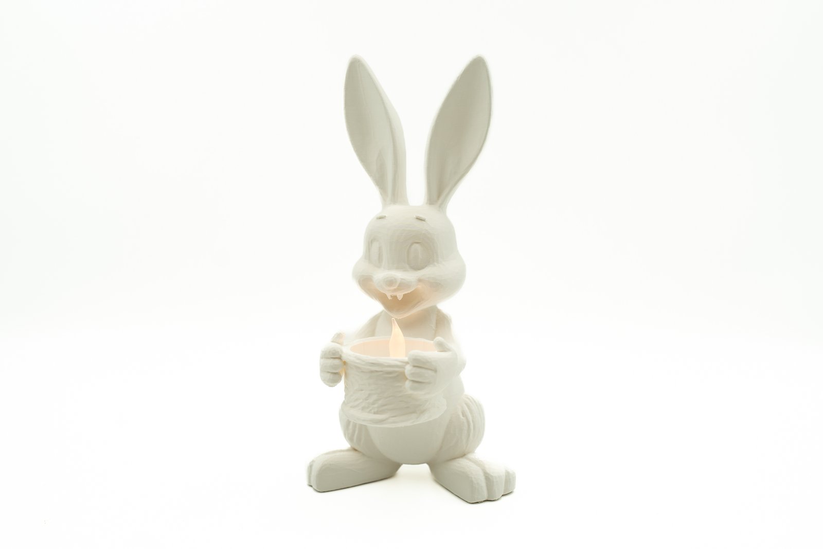 Duży zając wielkanocny z koszyczkiem wykonany w technologii druku 3D. Dekoracja o wysokości 25 cm umożliwia umieszczenie świeczki LED typu tealight lub ozdobnego jajka. Nowoczesna ozdoba stołu na Wielkanoc wykonana z PLA, idealna do domu lub biura.