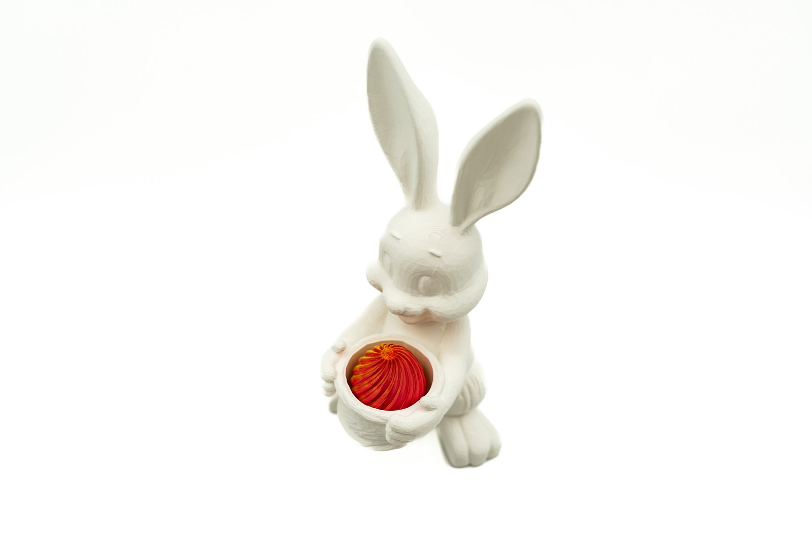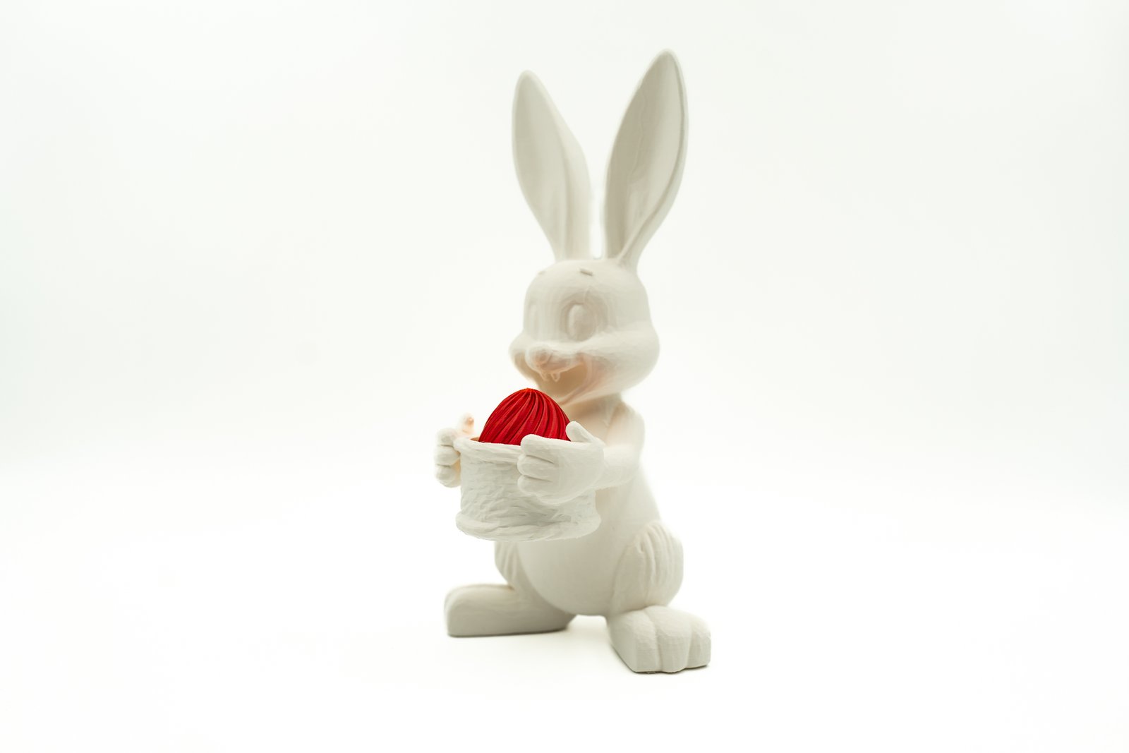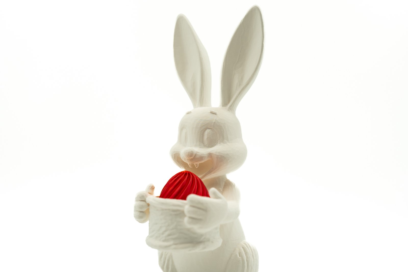 Dekoracyjny zajączek wielkanocny z koszyczkiem wykonany w technologii druku 3D z trwałego PLA. Smukła, nowoczesna forma oraz wysokość niemal 25 cm sprawiają, że figurka doskonale prezentuje się jako centralny element stołu, komody lub parapetu.